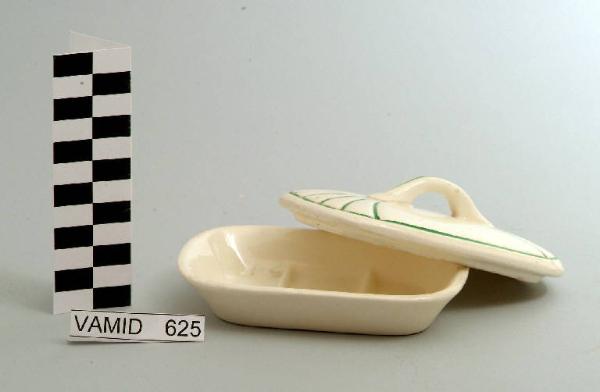 Portasapone con corpo di forma ovale; coperchio ovale con presa apicale; fondo color avorio con scanalature e profili rifiniti in verde.