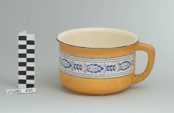 Pitale di forma cilindrica con bordo leggermente estroflesso ; manico liscio; fondo giallo con motivo decorativo vegetale stilizzato in blu all'esterno; bordo rifinito in nero; bianco internamente.