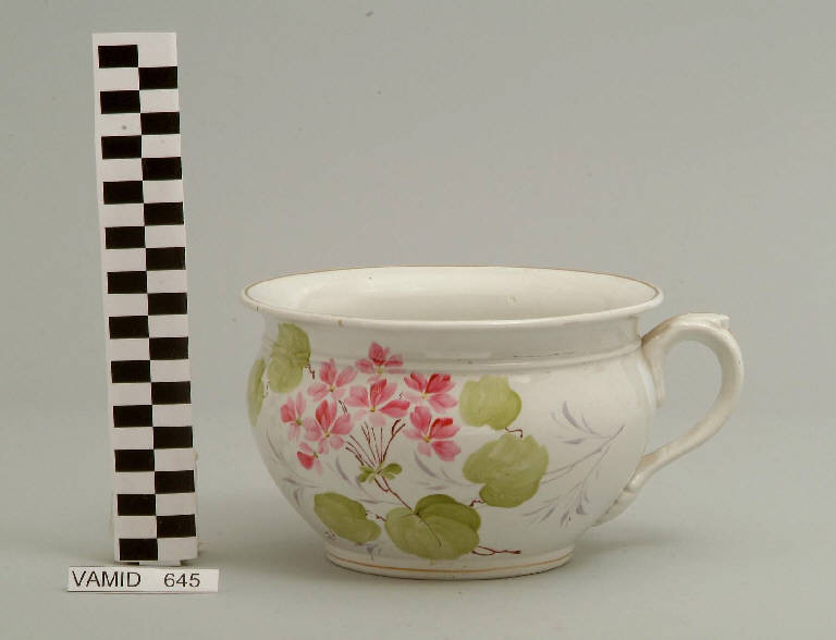 - NOTIZIE STORICO CRITICHE Il pitale, appartenente ad un servizio da camera (nn. inv. 644-646), è decorato a mano con motivo floreale policromo eseguito soprasmalto. La foggia ancora classica dell'oggetto in esame e il confronto stilistico con ciotole da colazione, prodotte in serie dalla Società Ceramica Italiana, conservate nel museo contrassegnate da nomi propri e da un decoro floreale simile fanno ipotizzare una datazione tra gli anni '20 e '30 del Novecento. Il marchio presente sul fondo fu in uso indicativamente dal 1883 al 1960 e fu impresso solo sulle terraglie prodotte nello stabilimento di San Cristoforo.