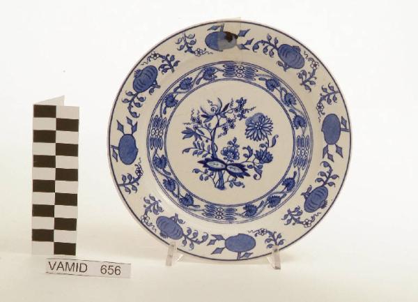 - NOTIZIE STORICO CRITICHE Il piatto da frutta, appartenente ad un servizio composto da tre elementi (nn. inv. 404, 656-657), è decorato a transfer sottosmalto con un motivo bu cobalto denominato "Meissen". Il marchio presente a tergo venne impresso su tutte le terraglie prodotte dalla Richard Ginori nello stabilimento di San Cristoforo indicativamente dal 1883 al 1960. Il confronto stilistico con un servizio da tavola realizzato nella forma "Vecchia Milano" da Guido Andlovitz in collaborazione con la S.C.I. nel 1929 ha permesso di ipotizzare una datazione tra gli anni '20 e '30 del Novecento. Nel museo di Laveno sono conservati altri due piatti con il medesimo decoro prodotti dalla S.C.I. nel 1924 e nel 1925 (nn. inv. 401-402).