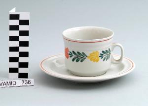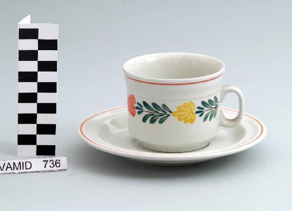 Tazza da colazione con corpo cilindrico; piede circolare; manico ovale; fondo bianco con motivo decorativo vegetale all'esterno in verde, giallo e arancio; piattino circolare; bordi rifiniti in arancio.
