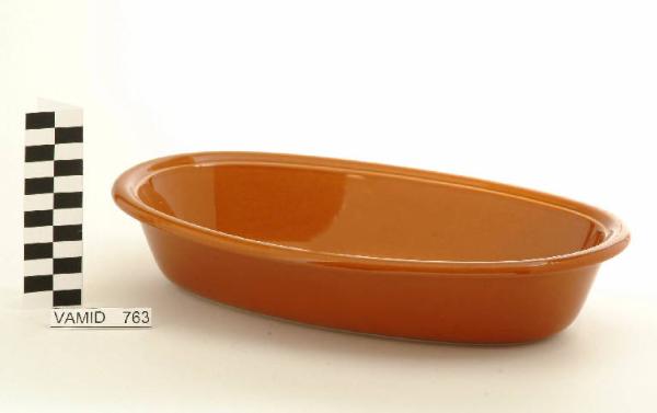 Pirofila ovale; bordo estroflesso; fondo marrone.