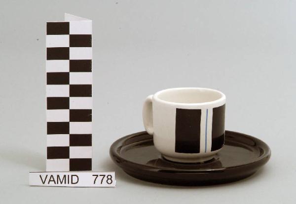 Tazza da caffè con basso corpo cilindrico; manico ovale; fondo bianco con motivo a strisce verticali in nero e azzurro; piattino circolare con bordo rialzato.