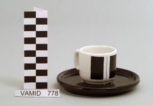 - NOTIZIE STORICO CRITICHE Il design essenziale e funzionale della tazza, appartenente ad un servizio da caffè (nn. inv. 775, 778-779), indica una datazione ormai avanzata nel Novecento. Come riporta il Peregalli, è riferibile alla produzione di Albino Reggiori. L'artista lavenese cominciò a fare ceramica nel 1955 ma fu dopo il 1981 che la sua ricerca si sviluppò prevalentemente nel campo ceramistico, in modo particolare sui materiali ceramici legati alla propria terra. Tipologicamente l'oggetto in esame si lega ad un servizio da tavola (nn. inv. 773...783) e ad un servizio da thè (nn. inv. 776, 780-781) conservati nel Museo delle Terraglie di Laveno. Il decoro è stato realizzato con la tecnica della decalcomania sottosmalto.