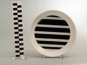 Piatto fondo circolare privo di tesa; fondo bianco con motivo a strisce verticali in nero e azzurro nel cavetto.