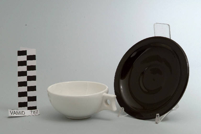 Tazza da thè con corpo sferico; manico squadrato; fondo bianco. Piattino circolare con bordo rialzato; fondo nero.