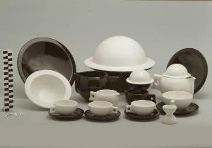 - NOTIZIE STORICO CRITICHE Il piatto piano, appartenente ad un servizio da tavola (nn. inv. 789-796), è realizzato nella forma "Saturno". Il design essenziale e funzionale indica una datazione ormai avanzata nel Novecentro. Come riporta il cartellino applicato alla zuppiera num. inv. 793, l'oggetto in esame venne realizzato nel 1970 dalle Ceramiche Pareschi in collaborazione con Albino Reggiori. L'artista lavenese cominciò a fare ceramica nel 1955 ma fu dopo il 1981 che la sua ricerca si sviluppò prevalentemente nel campo ceramistico, in modo particolare sui materiali ceramici legati alla propria terra. Tipologicamente l'oggetto in esame si lega ad un servizio da caffè (nn. inv. 784, 786, 800-803) e ad un servizio da thè (nn. inv. 785...804) conservati nel Museo delle Terraglie di Laveno.