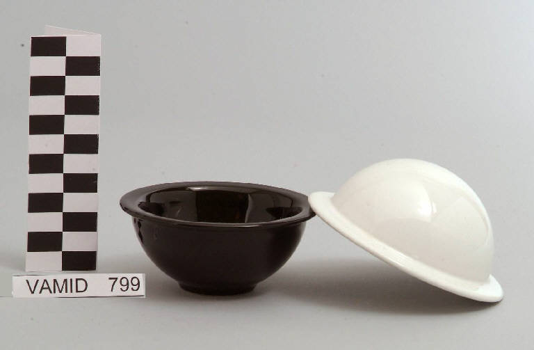 Zuccheriera con corpo sferico; fondo nero. Coperchio con corpo sferico; fondo bianco.
