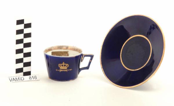 Tazza da thè con corpo leggermente svasato; restringimento in prossimità del piede; manico mistilineo; decoro con corona del Regno d'Italia in oro su fondo blu cobalto; bordi e manico in oro; bianco internamente. Piattino circolare; fondo blu cobalto con bordi rifiniti con filettatura oro.