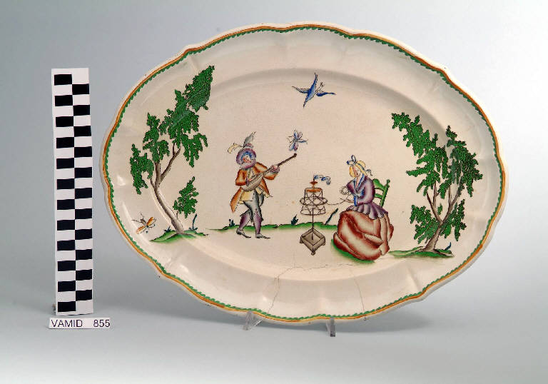 Piatto da portata ovale forma "Vecchio Milano" con tesa ondulata e bordo leggermente arcuato e modellato con una profilatura incisa; di colore bianco avorio con figure giocose in paesaggi campestri policrome.