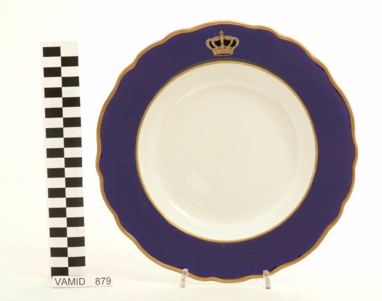 Piatto fondo con orlo festonato; fondo bianco avorio; tesa in colore blu Sevrès con corona del Regno d'Italia; bordo rifinito con filettatura oro.