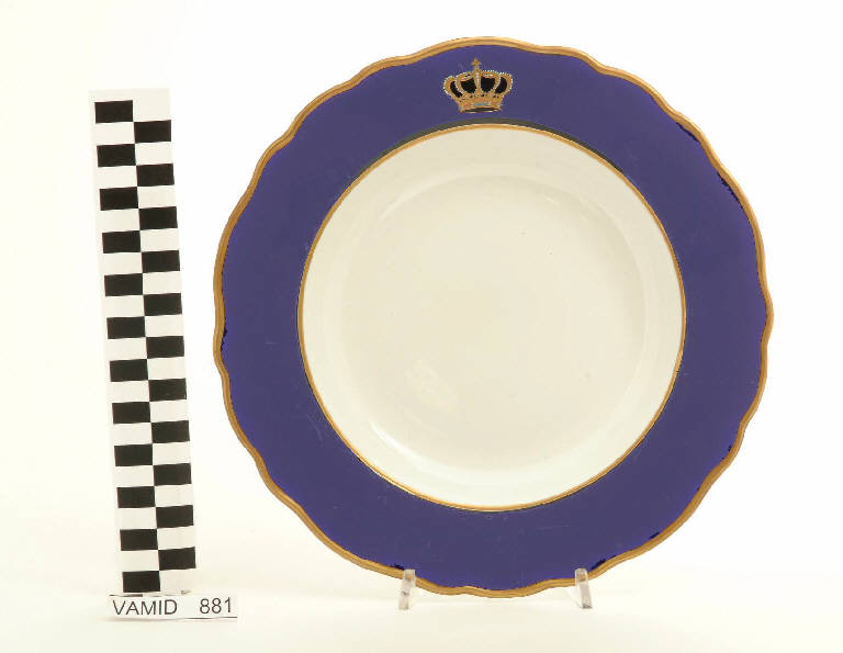 Piatto fondo con orlo festonato; fondo bianco avorio; tesa in colore blu Sevrès con corona del Regno d'Italia; bordo rifinito con filettatura oro.