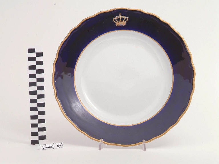 Piatto da portata circolare con orlo festonato; fondo bianco avorio; tesa in colore blu Sevrès con corona del Regno d'Italia; bordo rifinito con filettatura oro.