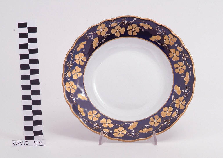 Piatto fondo con tesa ondulata (o festonata) decorata a fiori stilizzati in oro e argento su fondo blu Sevrès. Bordo rifinito con filettatura oro brillante. Fondo e parte restrostante in pasta bianca naturale.