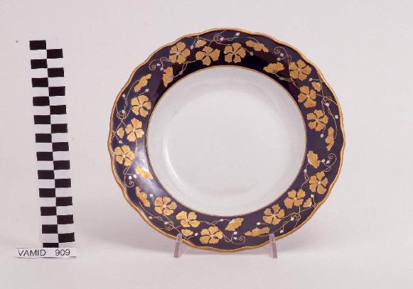 Piatto fondo con tesa ondulata (o festonata) decorata a fiori stilizzati in oro e argento su fondo blu Sevrès. Bordo rifinito con filettatura oro brillante. Fondo e parte restrostante in pasta bianca naturale.