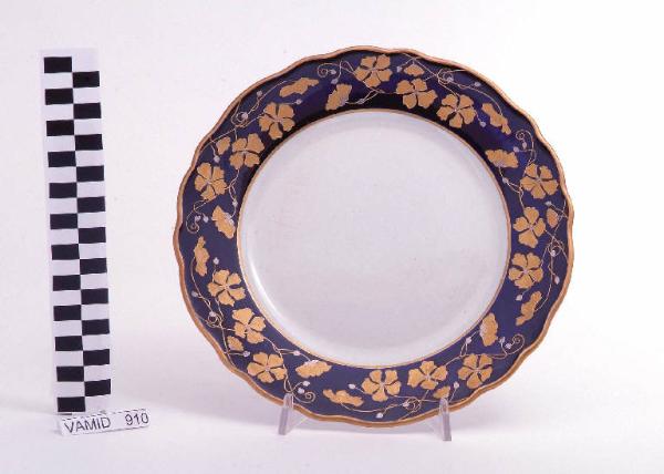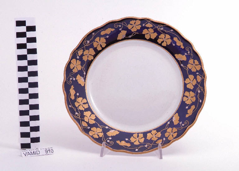 Piatto piano con tesa ondulata (o festonata) decorata a fiori stilizzati in oro e argento su fondo blu Sevrès. Bordo rifinito con filettatura oro brillante. Fondo e parte restrostante in pasta bianca naturale.