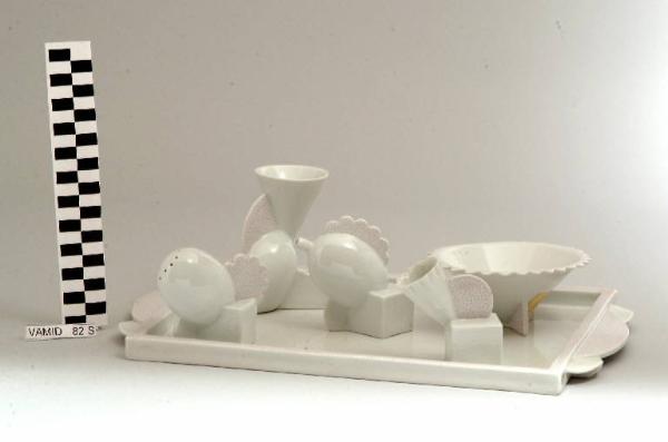 - NOTIZIE STORICO CRITICHE L'oggetto in esame, nella forma denominata "Michigan", fa parte di un servizio da tavola (nn. inv. 975-980) ideato da Matteo Thun, socio del gruppo Memphis dal 1981 al 1984.