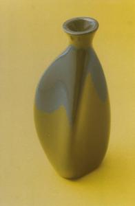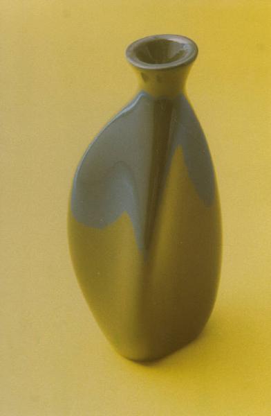 Vaso smaltato verde scuro lucido dalla forma vagamente triangolare; collo corto terminante con imboccatura circolare leggermente svasata.
