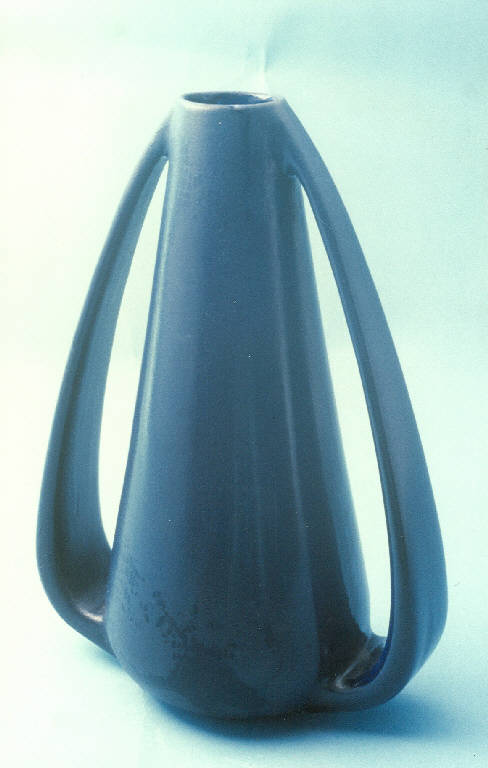 Vaso smaltato blu scuro con corpo conico; piede circolare; due manici che raccordano l'imboccatura circolare con il piede.