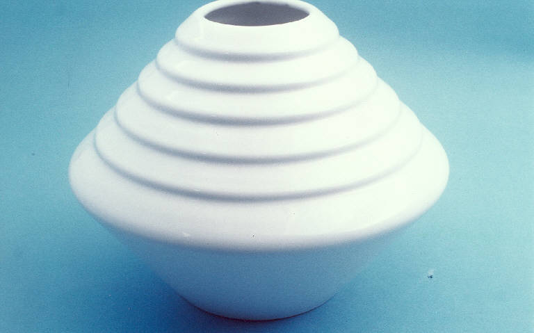 Vaso smaltato bianco lucido a sezione circolare con parte inferiore svasata e parte superiore a tronco di cono gradinato capovolto.