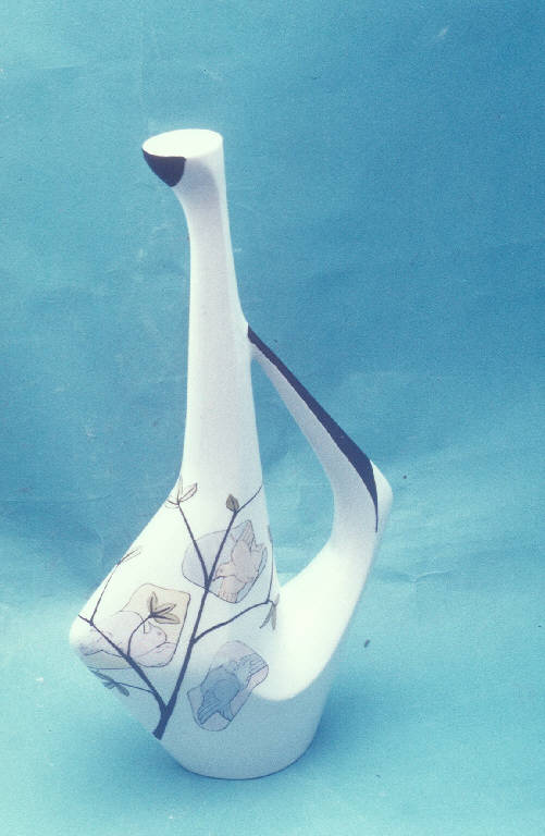 Vaso smaltato bianco lucido con corpo estroflesso in modo asimmetrico dalla forma vagamente triangolare; manico triangolare collocato in direzione opposta all'estroflessione del corpo; lungo collo terminante con beccuccio. Decorazione dipinta con raffigurazioni di colombe e rami di albero.
