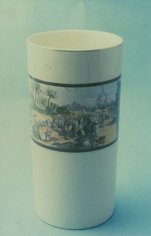 Vaso portafiori di colore avorio con corpo cilindrico; imboccatura con bordo dorato. Decorazione con paesaggio arabo.