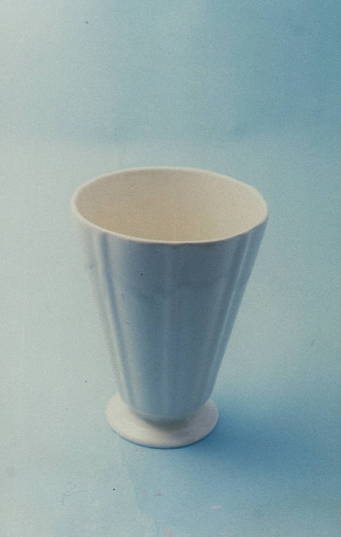 Vaso di colore avorio a tronco di cono a sezione sagomata formante costole verticali; piede circolare con breve strozzatura di raccordo.
