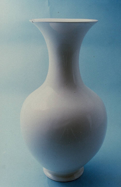 Vaso di colore bianco a sezione circolare con piccolo piede leggermente arrotondato, corpo globulare sormontato da collo e imboccatura svasata che si raccordano in modo continuo.
