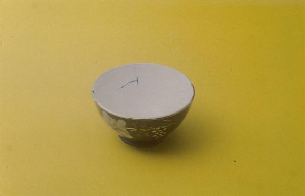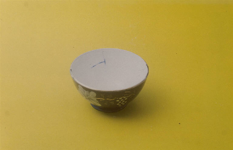 Ciotola di colore blu a sezione circolare con piede arrotondato. Decorazione a motivo vegetale con fiori e tralci vitinei nei colori oro e bianco.