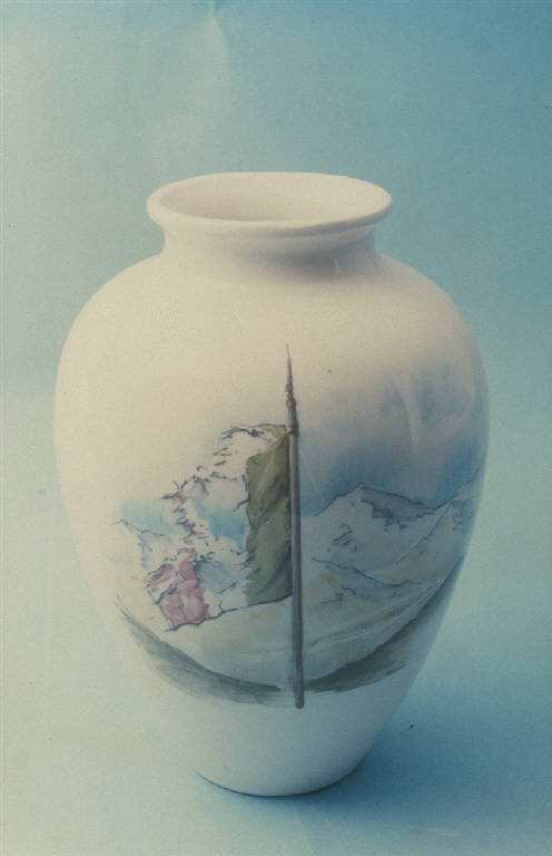 Vaso portafiori di colore bianco con corpo globulare; piede circolare; collo corto sormontato da imboccatura allargata. Decorazione dipinta a mano con paesaggio montano e bandiera italiana. Colori; azzurro, grigio, verde, rosso e marrone.