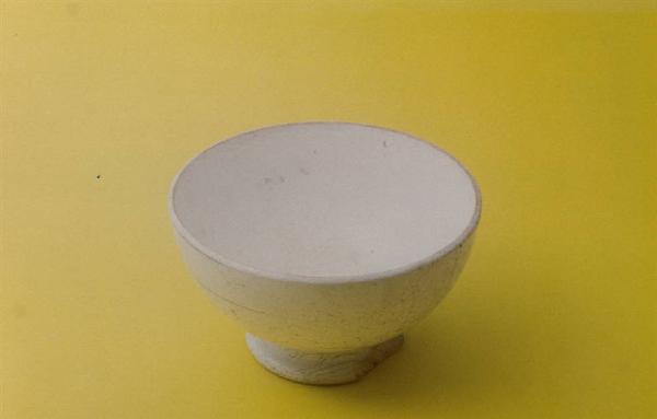 Ciotola di colore bianco a sezione circolare con piede arrotondato. Bordo dell'imboccatura rifinito in blu.