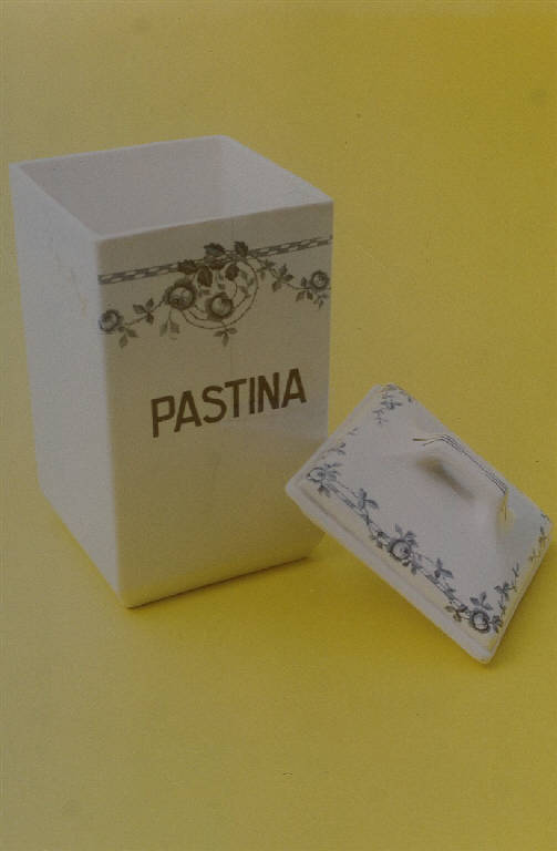 - NOTIZIE STORICO CRITICHE Come specifica la scritta sul lato principale, si tratta di un contenitore a forma di scatola per pastina. Il carattere naturalistico degli ornati con roselline e fogliette avvolte intorno a un bastone e raffigurate realisticamente con chiaroscuro e effetti luministici, indica una datazione al primo quarto del Novecento, datazione non contraddetta dal tipo di carattere scelto per l'iscrizione.