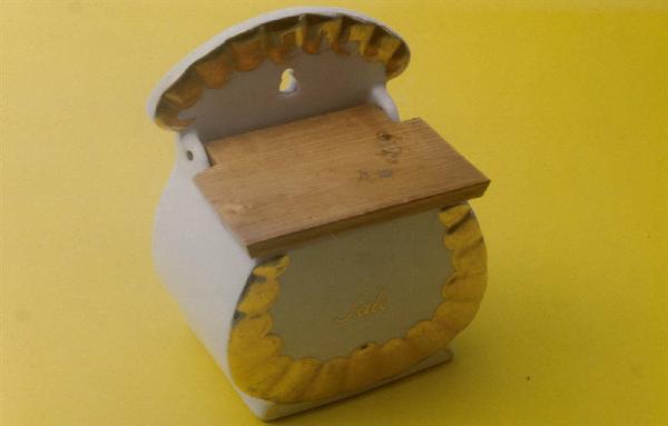 Cassetto portalimenti di colore bianco con piede rettangolare e coperchio in legno. Decorazione a rilievo con motivo bacellato in oro; scritta "Sale" in oro.