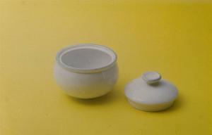 - NOTIZIE STORICO CRITICHE La zuccheriera, che fa parte di un servizio da thè (nn. inv. 1132, 1151-1152), presenta una forma globulare con predominanza della linea circolare. La rifinitura in smalto azzurro stesa in modo irregolare sui bordi conferisce un richiamo al vasellame "d'altri tempi". Tipologicamente si lega ad un servizio da tavola (cfr. nn. inv. 1267, 1285-1286) e ad una tazza da caffè (cfr. num. inv. 1556) conservati nel Museo delle Terraglie di Laveno. La datazione agli anni '70-'80 del Novecento è confermata dal marchio presente sulla teiera num. inv. 1151che è stato utilizzato dalla Richard Ginori dal 1950 al 1980.