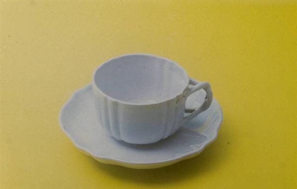 Tazza da thè smaltata in azzurro chiaro con costole verticali a rilievo; manico a ramo intrecciato. Piattino con bordo sagomato a rilievo.