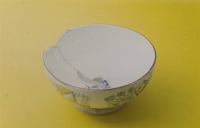 Ciotola di colore bianco a sezione circolare con piede circolare. Decorazioni con paesaggi cinesi. Bordi del piede e dell'imboccatura rifiniti in rosso.