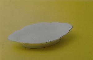 Raviera di forma ovale allungata con tesa ondulata rifinita in oro sul bordo; fondo bianco.