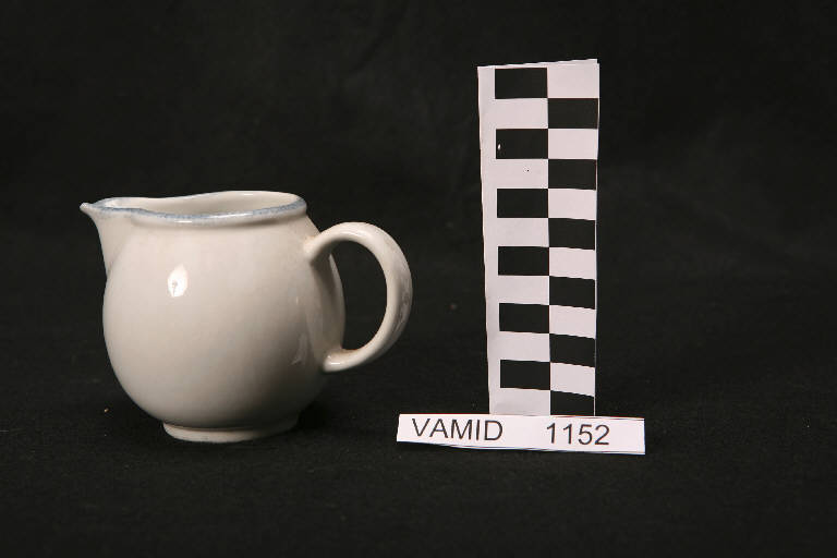 - NOTIZIE STORICO CRITICHE La lattiera, che fa parte di un servizio da thè (nn. inv. 1132, 1151-1152), presenta una forma globulare con predominanza della linea circolare ripetuta nel manico. La rifinitura in smalto azzurro stesa in modo irregolare sui bordi conferisce un richiamo al vasellame "d'altri tempi". Tipologicamente si lega ad un servizio da tavola (cfr. nn. inv. 1267, 1285-1286) e ad una tazza da caffè (cfr. num. inv. 1556) conservati nel Museo delle Terraglie di Laveno. La datazione agli anni '70-'80 del Novecento è confermata dal marchio presente sulla teiera num. inv. 1151che è stato utilizzato dalla Richard Ginori dal 1950 al 1980.