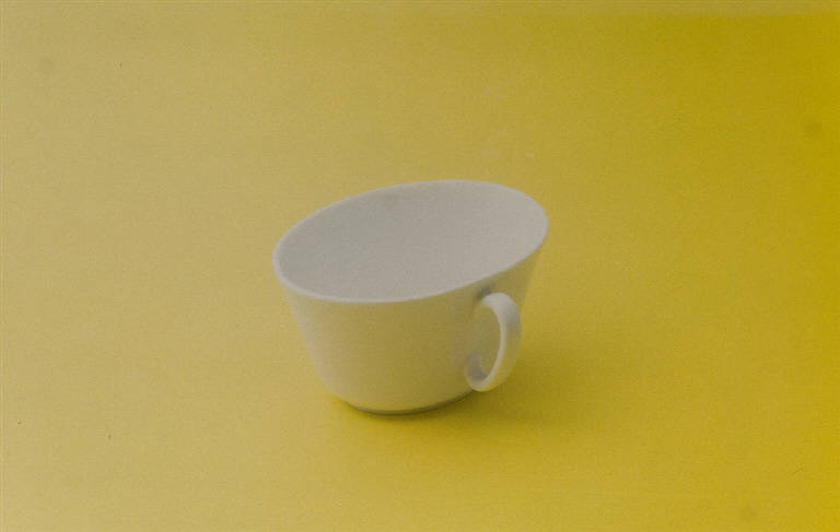 Tazza da thè di colore bianco con piede ovale; manico a "C"; imboccatura svasata.
