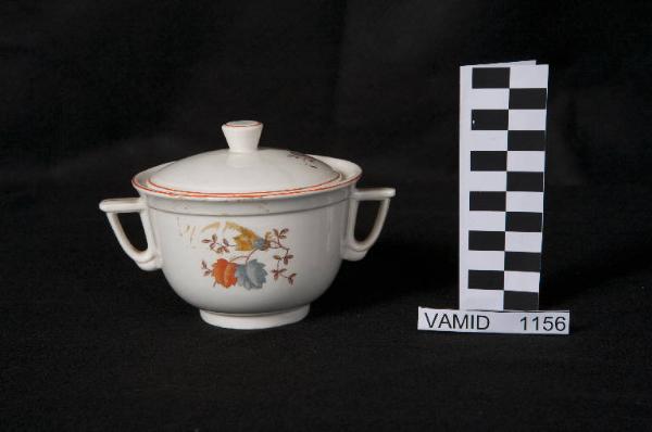 Zuccheriera con piede circolare, corpo liscio con raccordo curvilineo in basso, manici a "staffa"; coperchio circolare con pomolo apicale a tronco di cono rovesciato; fondo bianco con filettature in rosso sui bordi e decoro a ramoscelli di foglie e fiori nei colori rosso, grigio, giallo, marrone.