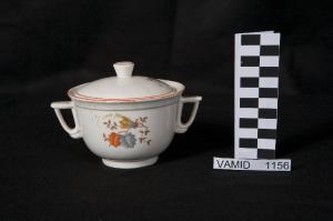 - NOTIZIE STORICO CRITICHE La zuccheriera fa parte di un servizio da thè insieme alla teiera e alla lattiera conservate al MIDC (inv. nn. 1155, 1157). L.a forma evidenza una semplificazione del modello tradizionale di zuccheriera e un'attenzione agli aspetti ergonomici e funzionali (si veda ad esempio i manicini superiormente piatti per un appoggio sicuro e comodo del pollice). Anche nel decoro si reinterpreta in chiave stilizzata e semplificata una composizione a ramoscelli di fiori e foglie di tipo tradizionale. Il decoro è erealizzato con la tecnica della decalcomania sottosmalto. Tipologicamente si lega ad un servizio da tavola conservato presso il Midec (num. inv. 2981, 3654-3655).