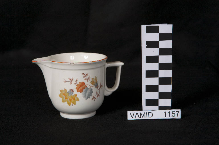 - NOTIZIE STORICO CRITICHE La lattiera fa parte di un servizio da thè insieme alla teiera e alla zuccheriera conservate al MIDC (inv. nn. 1155, 1156). L.a forma evidenza una semplificazione del modello tradizionale di zuccheriera e un'attenzione agli aspetti ergonomici e funzionali (si veda ad esempio il manico superiormente piatto per un appoggio sicuro e comodo del pollice). Anche nel decoro si reinterpreta in chiave stilizzata e semplificata una composizione a ramoscelli di fiori e foglie di tipo tradizionale. Il decoro è erealizzato con la tecnica della decalcomania sottosmalto. Tipologicamente si lega ad un servizio da tavola conservato presso il Midec (num. inv. 2981, 3654-3655).