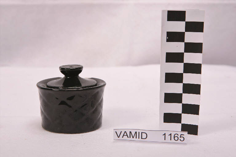 Vasetto smaltato nero con corpo cilindrico; imboccatura estroflessa; coperchio.