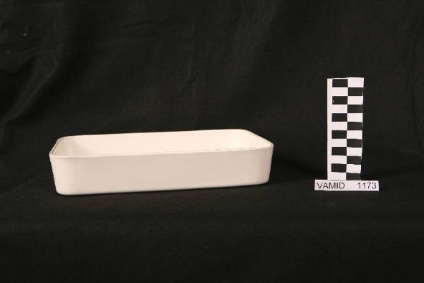 Casseruola smaltata bianca di forma rettangolare.