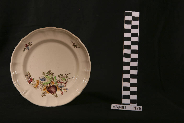 Piatto da frutta circolare con tesa ondulata e bordo leggermente arcuato e modellato con una profilatura incisa; fondo bianco avorio con mazzo di fiori policromo in posizione decentrata sul fondo e piccoli tralci fioriti lungo la tesa.