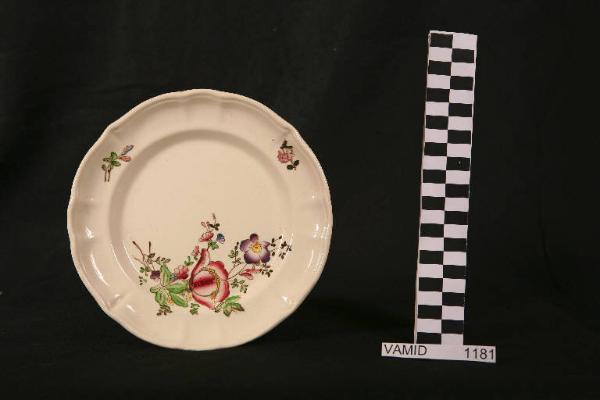 Piatto da frutta circolare con tesa ondulata e bordo leggermente arcuato e modellato con una profilatura incisa; fondo bianco avorio con mazzo di fiori policromo in posizione decentrata sul fondo e piccoli tralci fioriti lungo la tesa.
