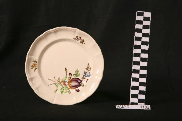 Piatto da frutta circolare con tesa ondulata e bordo leggermente arcuato e modellato con una profilatura incisa; fondo bianco avorio con mazzo di fiori policromo in posizione decentrata sul fondo e piccoli tralci fioriti lungo la tesa.