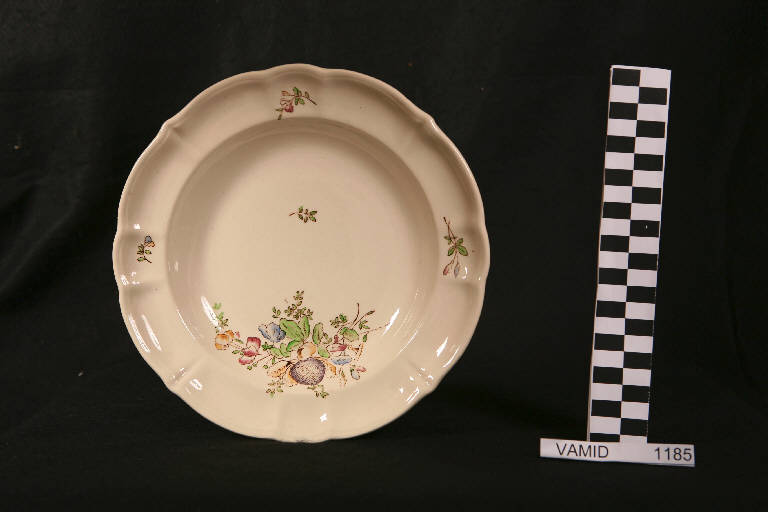 Piatto fondo circolare con tesa ondulata e bordo leggermente arcuato e modellato con una profilatura incisa; fondo bianco avorio con mazzo di fiori policromo in posizione decentrata sul fondo e piccoli tralci fioriti lungo la tesa.