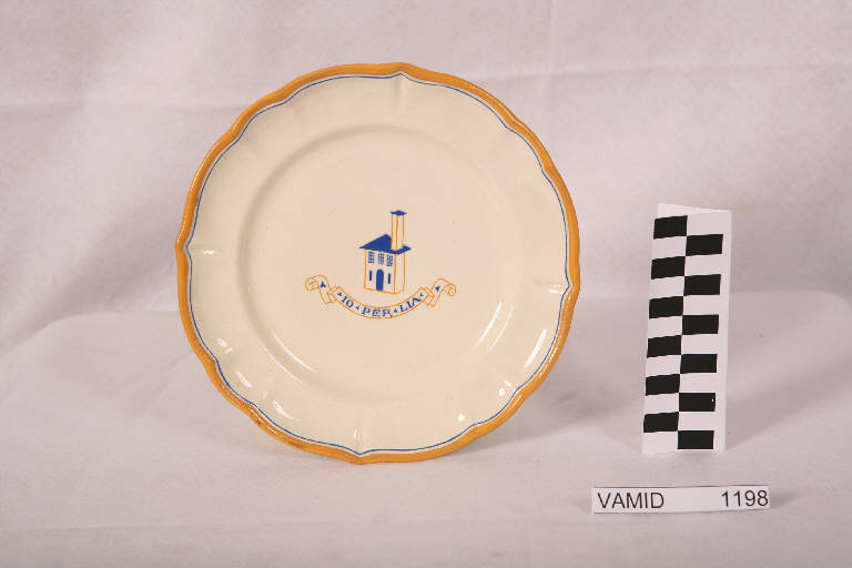 • NOTIZIE STORICO CRITICHE Il piatto fa parte di un servizio da tavola composto di undici piatti da frutta, quindici piatti piani, sette piatti fondi, due piatti da portata, una salsiera, una formaggera, una zuppiera e una insalatiera (inv. nn. 1195-1205, 1223-1237, 1239-1249, 1258). Il servizio è realizzato nella forma Vecchia Milano con decoro ideato dall'architetto milanese Piero Portaluppi in omaggio alla moglia Lia Baglia, sposata nel 1913. Il servizio, denominato "Piero e Lia", presenta infatti il disegno di una casa, simbolo della famiglia e del focolare e anche dell'attività di architetto del Portaluppi, e un cartiglio con sei iscrizioni diverse, tutte anagrammi di "Piero e Lia", che si alternano sui vari oggetti. Gli anagrammi ("Pria e l'io", "Piroleai!", "Io per Lia", "Ire al poi", "Pari o' lei", "O' iperali") sono talvolta licenze poetiche, quasi dei 'non sense', ma proprio per questo introducono a un mondo privato e amorevole fatto di un'intesa esclusiva, e in questo sta il fascino di questa invenzione di Portaluppi. L'architetto fu spesso attivo per Laveno-Mombello, ma soprattutto negli anni venti, quando eseguì uno studio per un albergo (1922), il villino per il direttore della Società Ceramica Italiana (1923), il Parco della Rimembranza, lo Stabilimento della Società Ceramica Italiana in via Buozzi (1924-1926), il progetto per lo stabilimento Verbano in via XXV aprile (1924) e il progetto per l'ampliamento del cimitero (1925).\nFigura poliedrica, attiva anche nei campi del disegno, della vignetta e del design, il Portaluppi si cimentò nella progettazione di ceramiche per la S.C.I. (di cui fu anche il direttore artistico) come il superbo vaso in blu cobalto con decori in oro del 1923 (in. nn. 1861-1862) tuttora conservato in una sala del museo e in questo originalissimo servizio, databile ancora agli anni venti. Proprio in quegli anni Portaluppi manifestò in un'altra occasione il gusto per gli anagrammi: nel 1926, incaricato del Piano Regolatore di Milano insieme a Marco Semenza, chiamò il Piano "Ciò per amor" dal nome di entrambi.