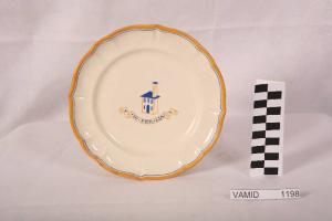 Piatto da frutta circolare con tesa ondulata e bordo leggermente arcuato e modellato con una profilatura incisa; di colore bianco avorio con disegno sul fondo nei colori giallo carico e blu raffigurante una casa con lungo comignolo e un cartiglio sottostante con iscrizione; tesa bordata di giallo carico e profilatura in blu.